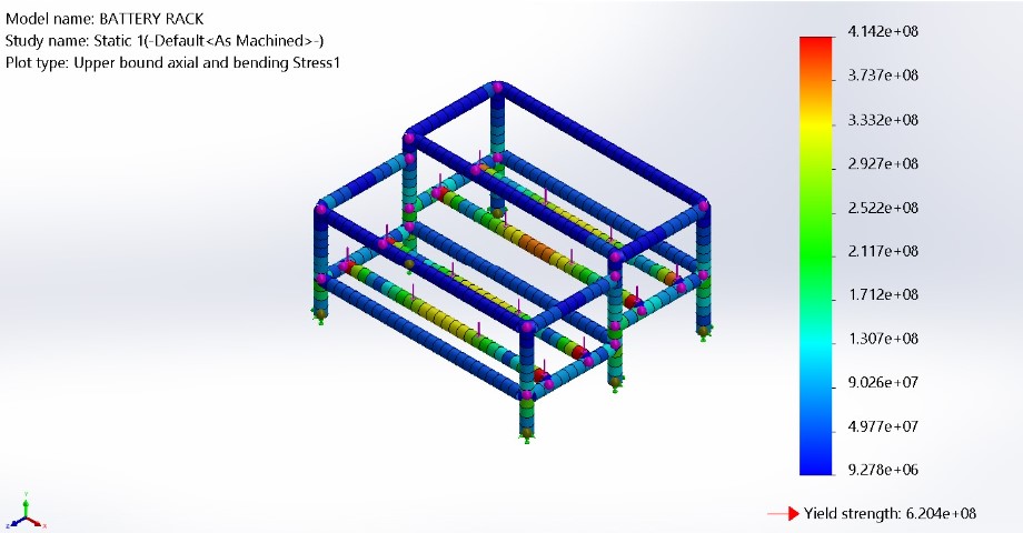 In SolidWorks I drafted a 3D sketch of where I would need structural members. This stand is really important because the floor of our cabin typically floods, and the batteries need to be spaced apart (Figure 2). I then used the weldments feature to insert different geometries of steel for each member (Figure 1). I chose between square tube, C channel, and angle iron. I did a static simulation using Finite Element Analysis (FEA) to understand where the highest loads were (Figure 3). After establishing those locations, I edited my steel geometries to optimize strength and cost.