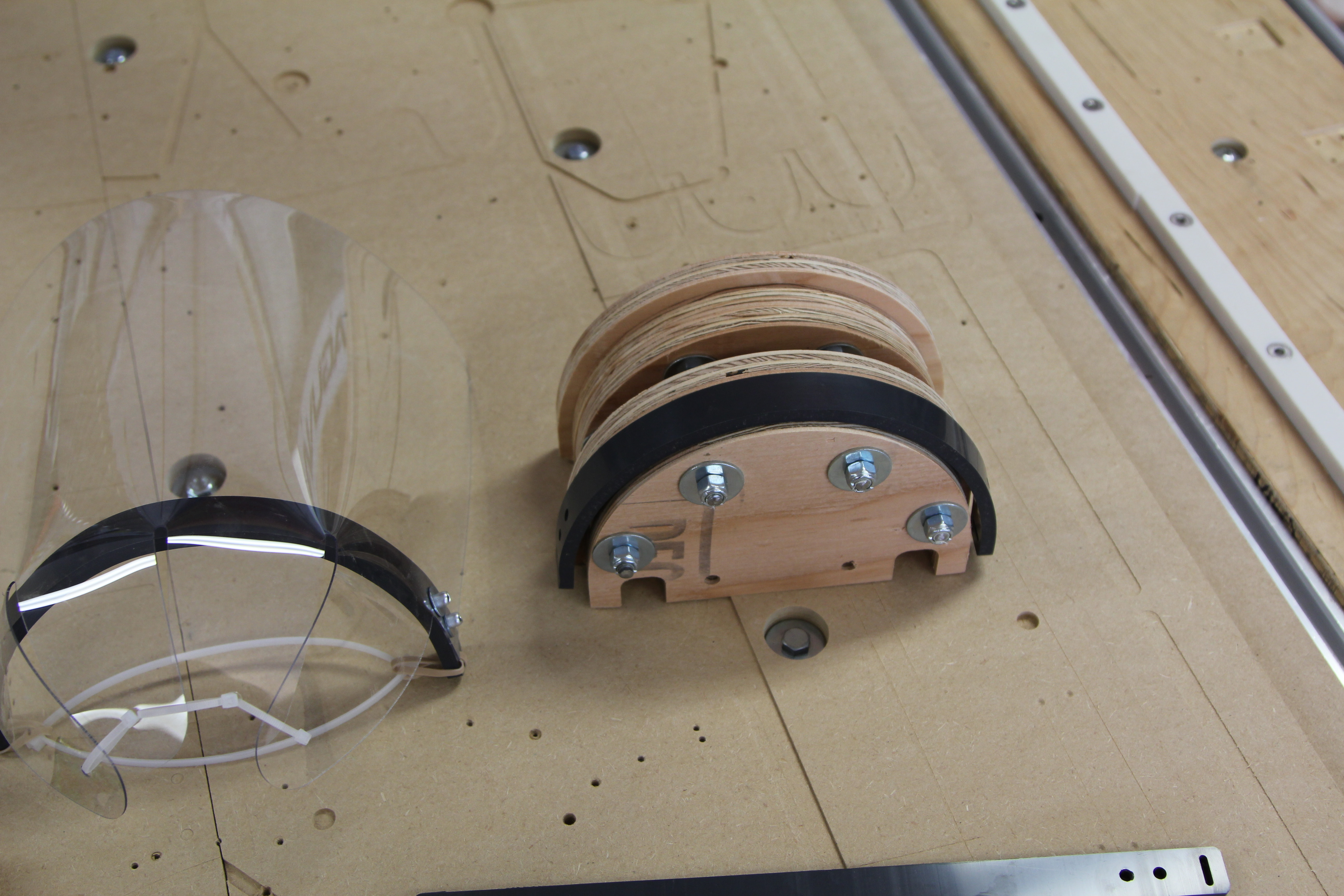 With a solidified design, I needed to source materials. While making an early batch, a neighbor noticed us working and mentioned he had connections with some friends who were also working on shields. Through this connection, he sourced materials that had been donated by Coca-Cola. With excess material, our only limitation was production capacity. The bottleneck was bending the plastic headbands, which involved heating the cut parts in an oven and molding them onto a manifold. To increase our output, I designed new manifolds that could hold more headbands and distributed them to our neighbors. With this small army, our output significantly increased.