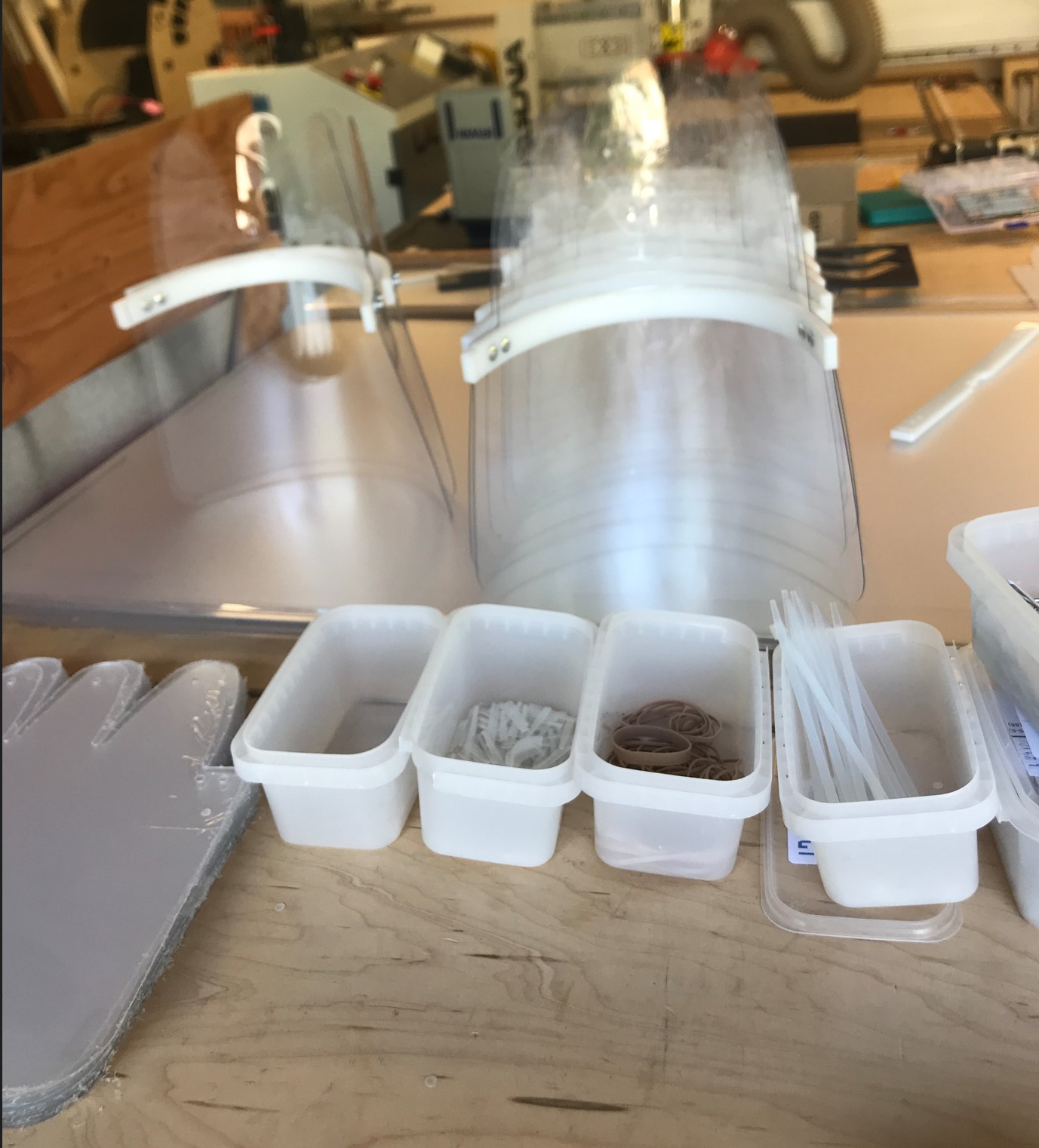 Although I had experience in design and fabrication, I had never worked on something that needed to be medical-grade, so I had to do some research. The most pressing issue with face shields and medical devices was minimizing areas that might not be effectively cleaned, which could allow bacteria to survive. With this in mind, I reduced the part count and avoided using elastic fabrics for the headband. Instead, I chose rubber bands and zip ties as comfortable replacements for elastic, and the design was ready for production.