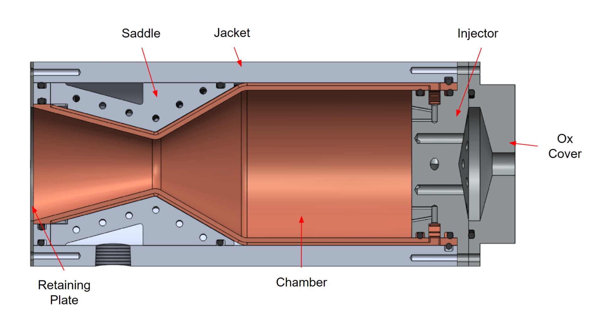We set the following design goals to create a baseline for the first iteration of our engine: use gaseous oxygen and kerosene as propellants, and use kerosene to regeneratively cool our engine. This engine was not designed to fly on a rocket but instead to help us learn about designing, manufacturing, and testing engines.