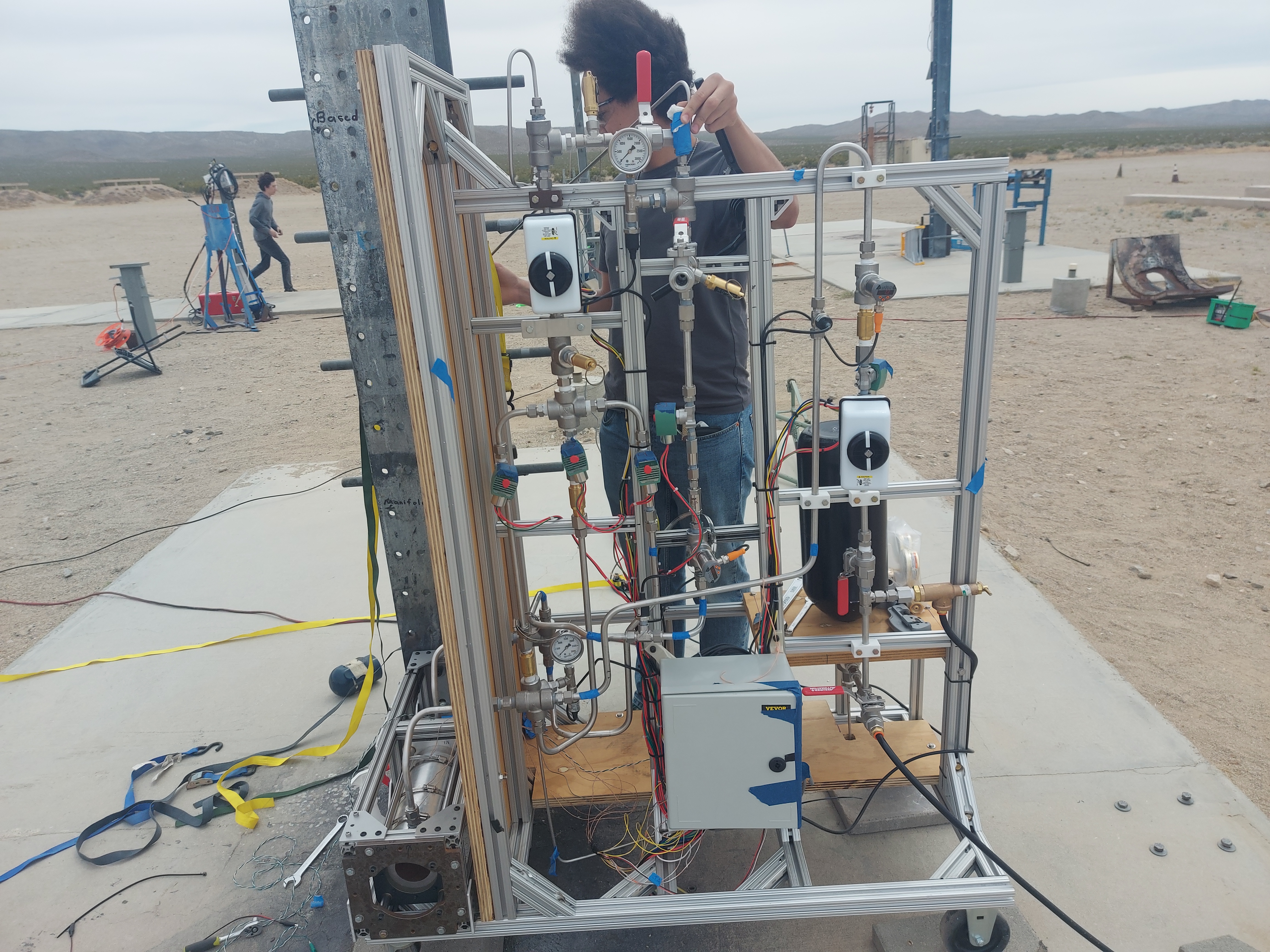 I am responsible for developing the testing infrastructure for our engine. To supply our oxidizer and fuel, a high-pressure plumbing system was designed and built. Both high-pressure gases and oxidizers are extremely dangerous, so burst disks, pressure relief valves, and remotely controlled valves were implemented to ensure the system could be manually loaded and remotely operated. The test stand was built and tested at low and high pressures on campus with inert gases before being transported to Friends of Amateur Rocketry (FAR), where we attempted a static fire (Figure 3 and 4). Last May, we attempted to static fire our engine but faced ignition and control issues. We will be working this fall to address these issues and achieve ignition!