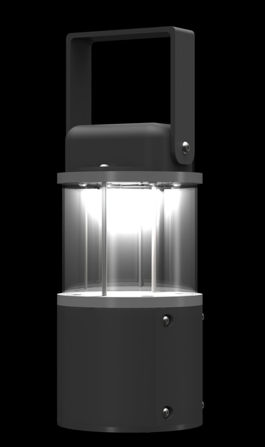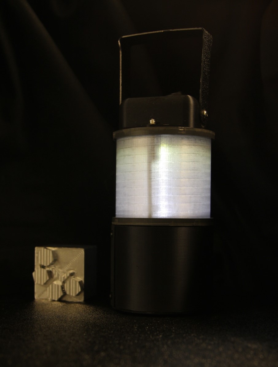 The batteries and charging components are stored in the bottom half, while the step up, switch and dimming circuit are stored in the top. Two threaded rods take power from the bottom to the top. A noticeable difference between the render and photo show the addition of a diffuser on the light which makes the operation a lot more pleasant (Figure 2). After learning about conics in my math class, I added a conical reflector beneath the LED to help disperse the light.