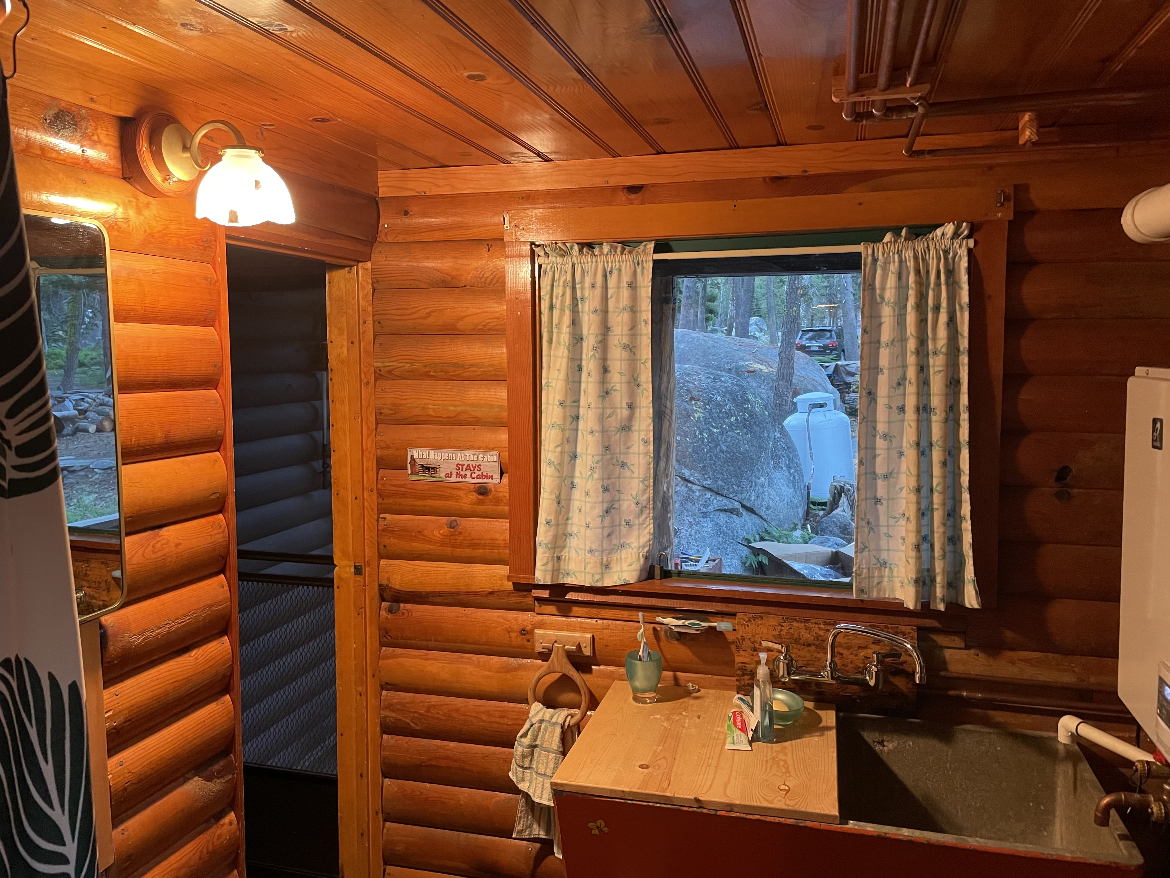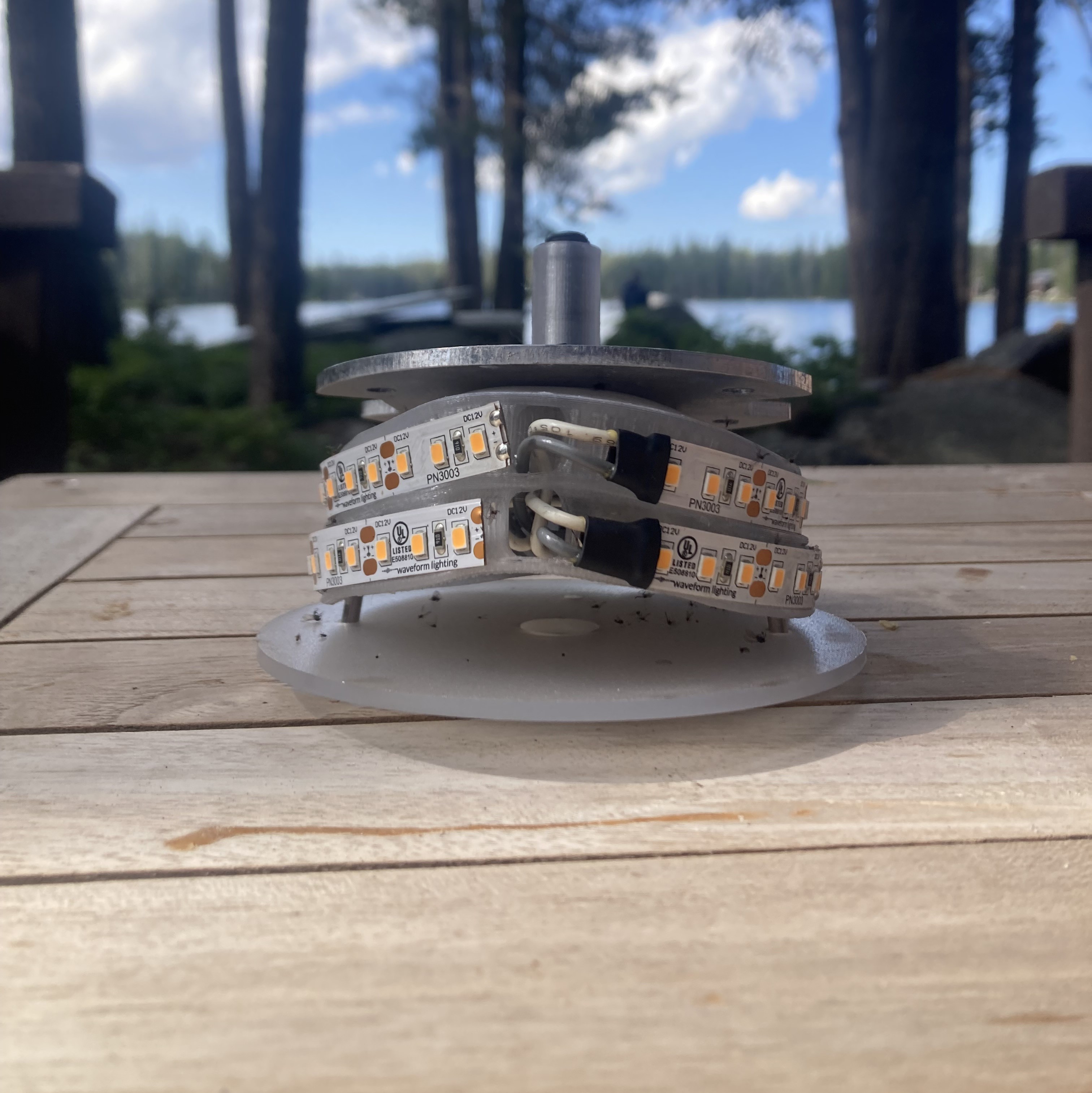 The electronics are powered by a solar system we recently installed to support our water system and other appliances within the cabin. Our batteries supply 24 volts of DC current that powers the entire cabin. To prevent issues with voltage drop over the long wires running to the light fixtures, each fixture operates on 12 volts. A buck converter is placed in front of a strip of LEDs that produce the light. To replicate the feel of the gas fixtures, I chose a similar color of light. After experimenting in similarly sized dark rooms, I determined that around 1800 lumens would be needed.