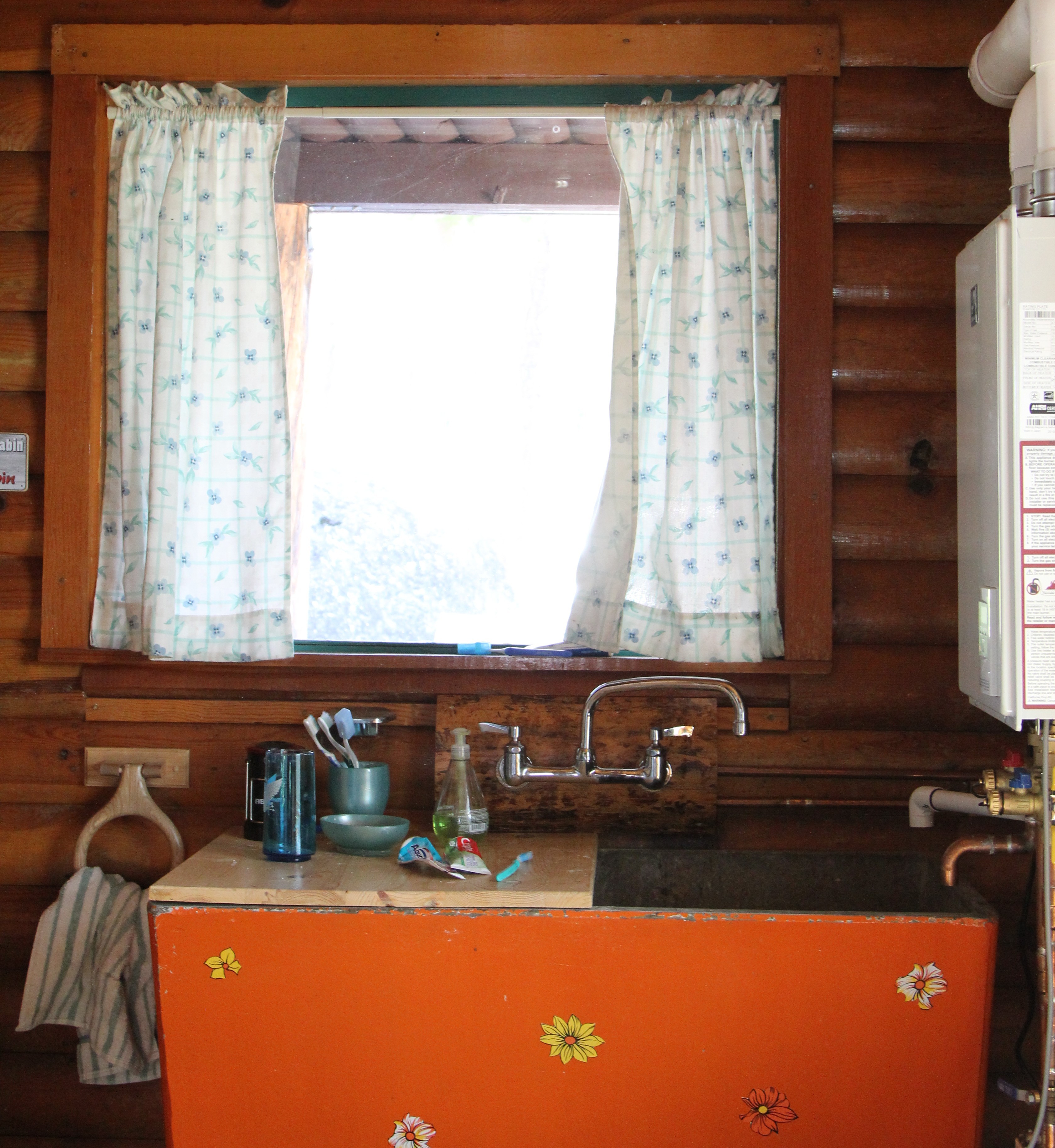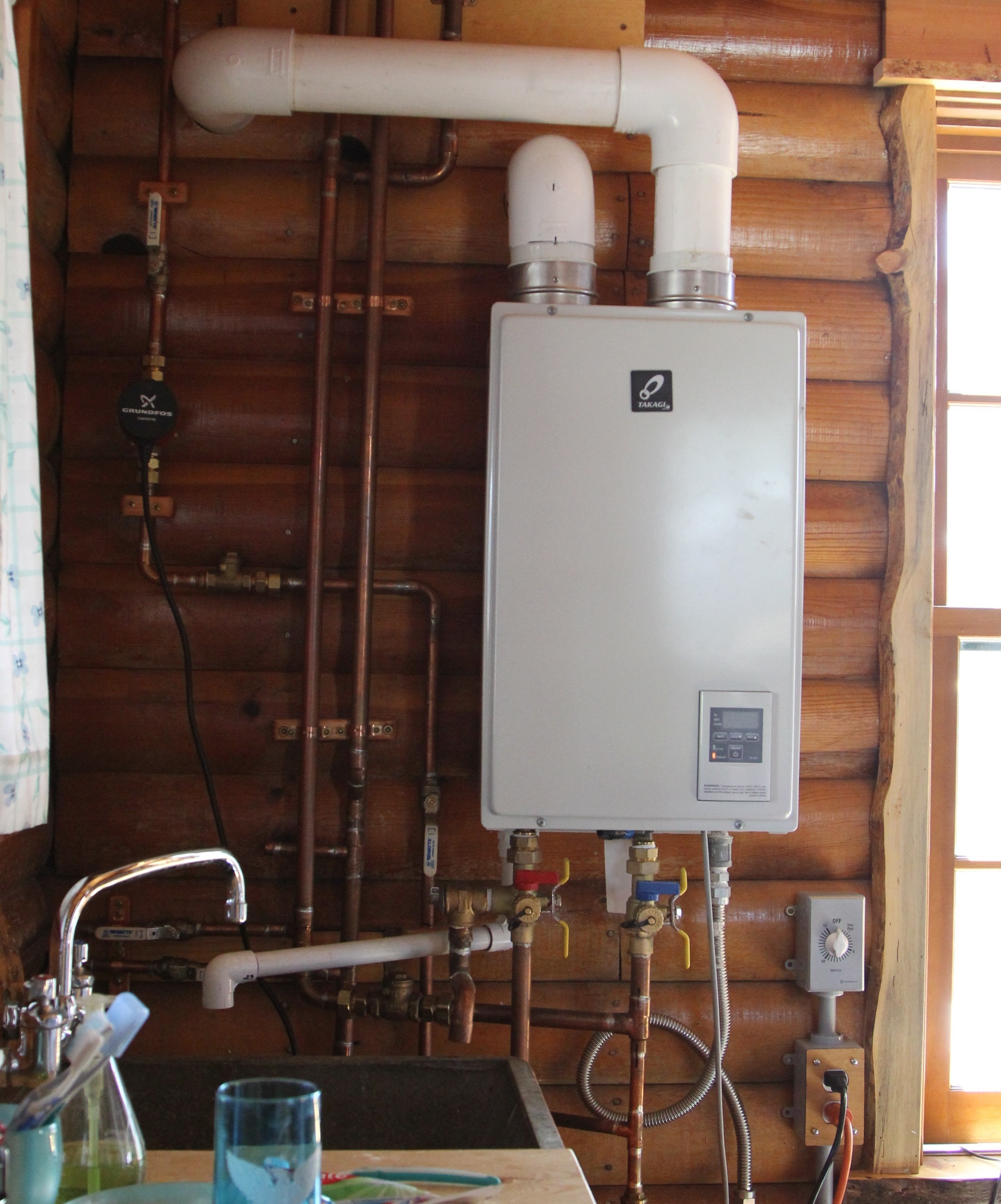 Running water itself is game-changing in an off-grid cabin, but once you have water, adding hot water isn’t that much more work. The cabin already has propane, so we installed a propane instant hot water heater shown in Figure 3. One major issue is that it can take a while for some of the water to get to temperature, so we installed a circulation loop. The circulation loop circulates water through the heater, turning it on and getting up to temperature before water is needed, so if you want a hot shower, you gotta turn the timer on the circulation pump on for 5 minutes before you shower. This ensures that we aren’t wasting gallons of water waiting for the shower to heat up, but rather the water is hot when the faucet is turned on.