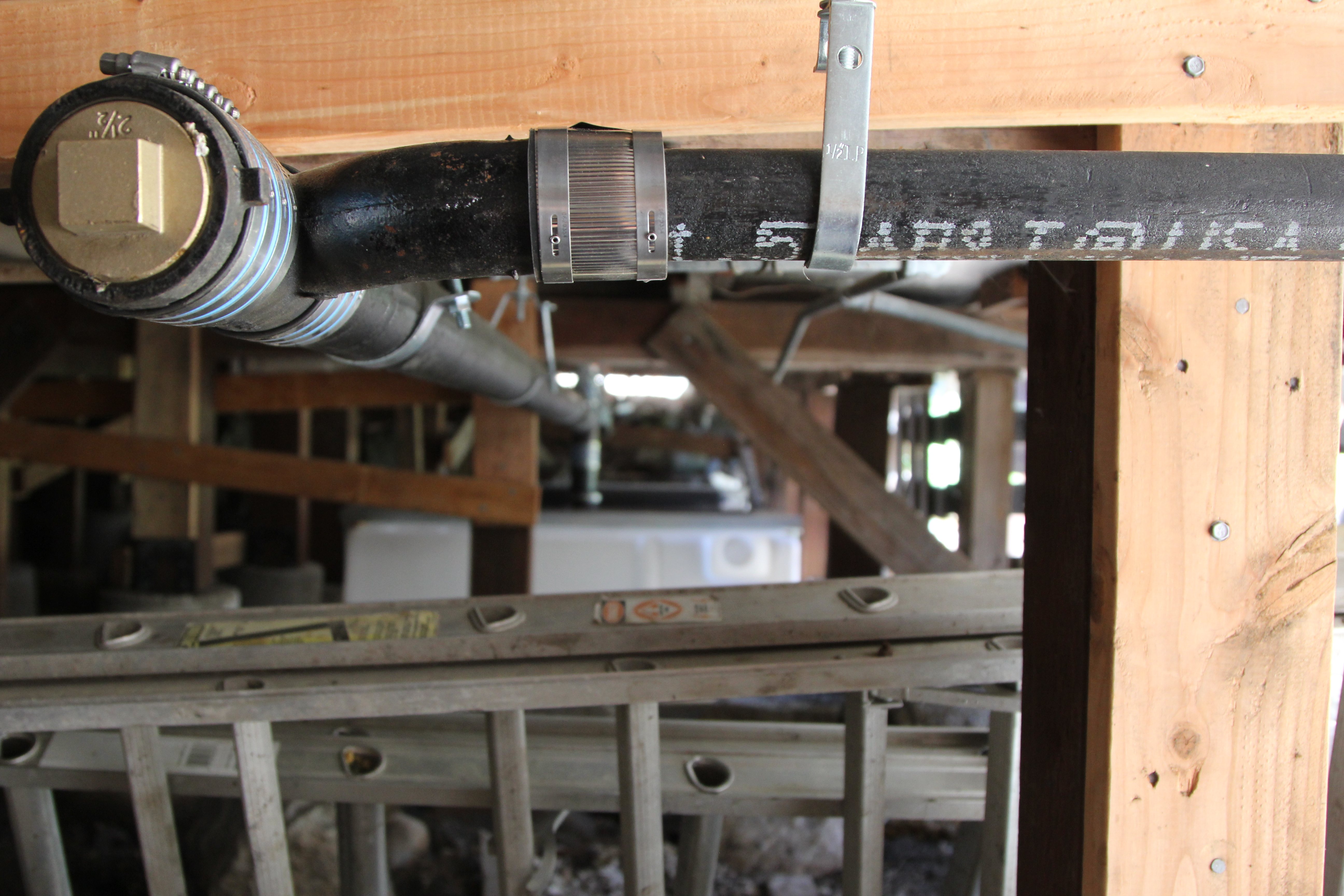 Once water has been used in the sinks or shower, it is now considered grey water. Underneath the cabin sits a storage tank where this water is collected and then can be correctly disposed of. Installing pipes, shown in Figure 4, and hanging them underneath a cabin next to a swamp is not exactly the most fun activity. To reduce the time spent under there measuring and cutting, I took measurements of the locations of the drains, tank, and floor beams. With these measurements, I drafted a CAD model and assembled the pipes digitally to get a bill of materials and pipe lengths that we could use during fabrication.