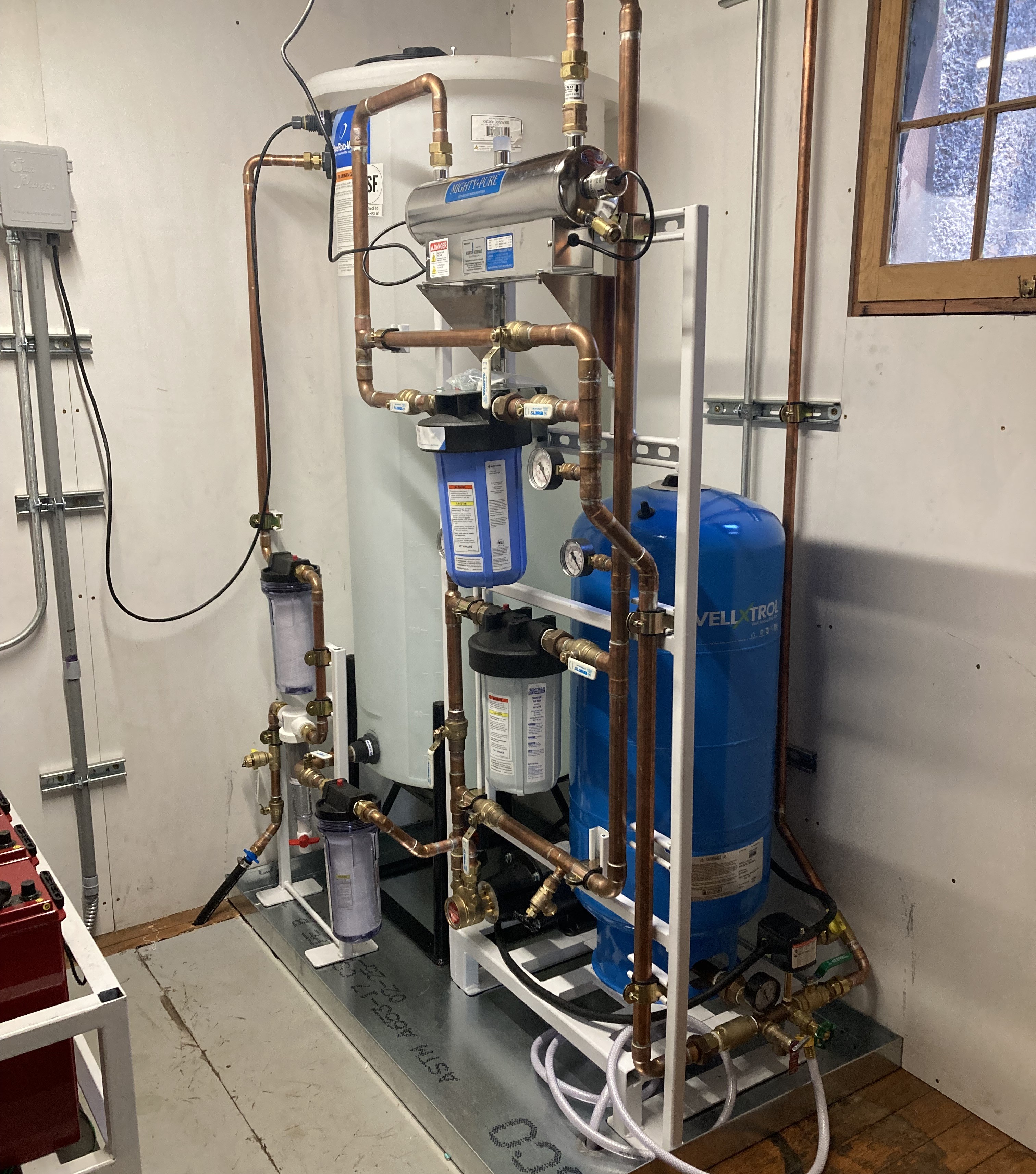 The main goal for the clean system, shown in Figure 1, is to collect, filter, and provide water to faucets. Water is pumped out of a well using a submersible pump, shown in Figure 2, that hangs from the top of the well and dangles near the bottom. At this point, large particles are filtered out of the water to make sure large amounts of dirt, silt, or other large contaminants do not make it into our storage tank. The water rests in a 100-gallon storage tank that uses a float sensor to detect if it is full and turn the pump on and off. Using this float switch, the frequency at which water is pulled from the well can be set, which is important since the well needs time to replenish. This water is sitting on the first floor in a tank and needs to be distributed to the rest of the cabin. A pressure pump and pressurized tank accomplish this. Large pressurized tanks are expensive and hard to clean. For these reasons, we have a smaller pressurized tank and a pump that works to pressurize it to 25 gallons for the tank size. To pressurize our tank, water flows out of our large storage tank and gets pumped by a high-pressure pump. We learned the hard way that pressure relief valves were needed when a water filter cracked and exploded after a valve was accidentally closed. Before it reaches the pressurized tank, the water makes it through smaller and smaller filters, then a UV filter, and finally one last fine particulate filter. These filters remove the last small particulates, kill any bacteria in the water that could be harmful, and then remove the bacteria. This pressurized water now can flow into the two faucets and one shower. All of these pumps and the UV filter operate on the solar electrical system that powers our cabin in another project I designed and welded a battery rack for that system.